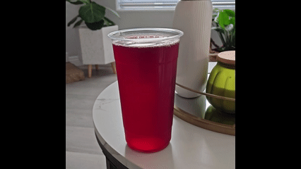 El líquido se mantiene perfectamente nivelado, lo que confirma que el vaso conserva su forma bajo el peso de la bebida y la presión natural al sujetarlo.